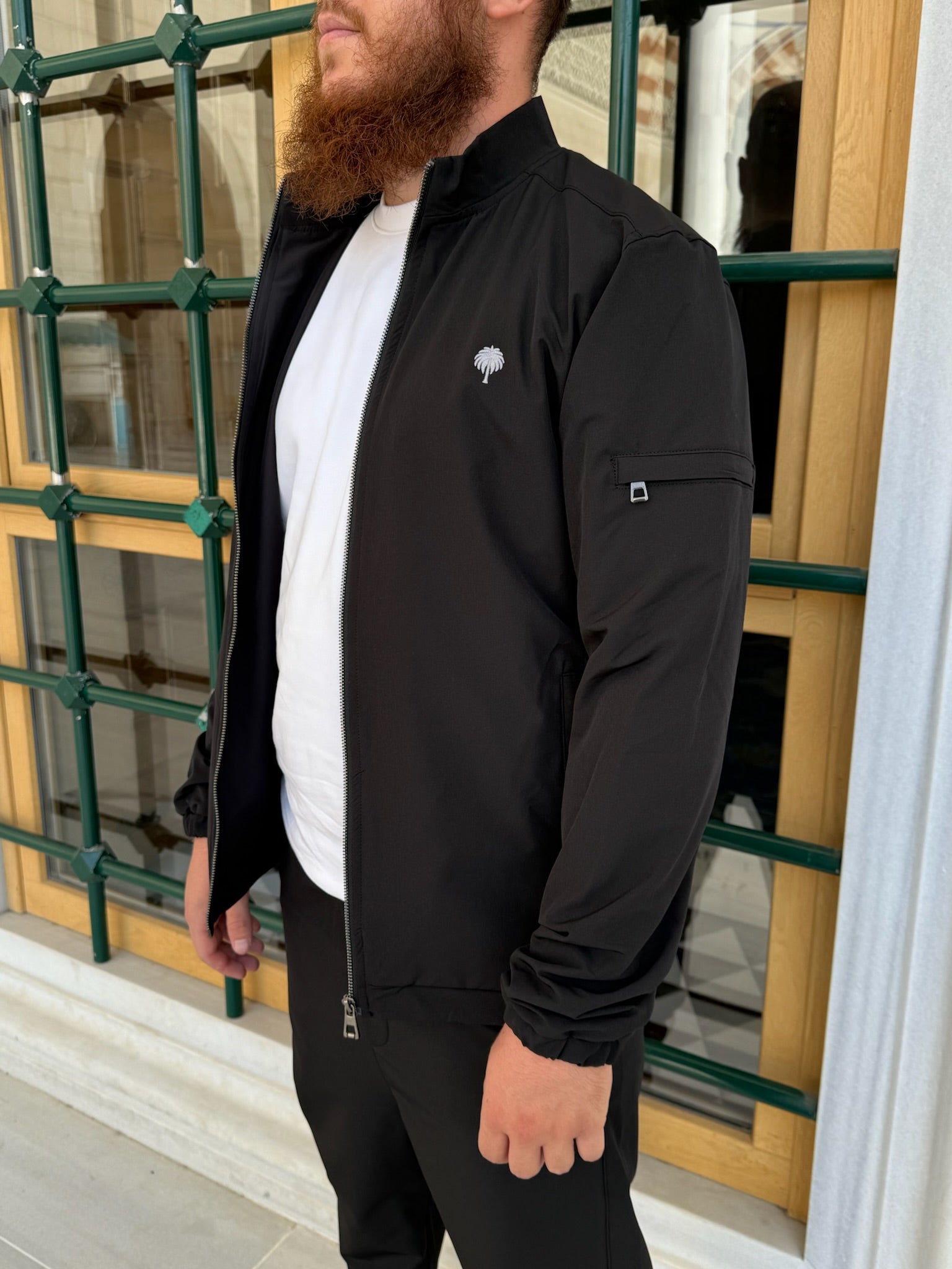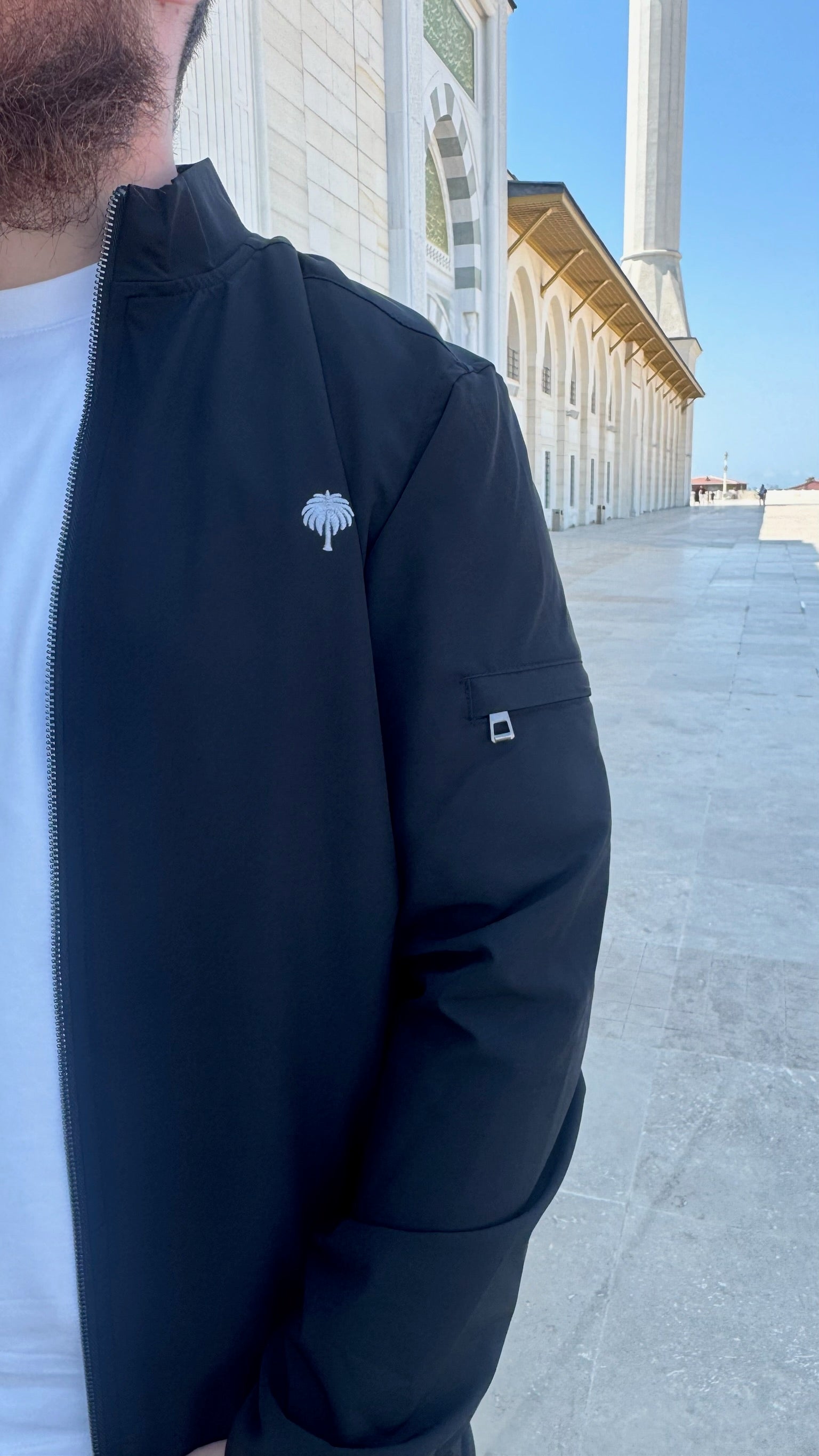 Veste légère coupe bomber en tissu beige, avec poches pratiques et fermeture zip.